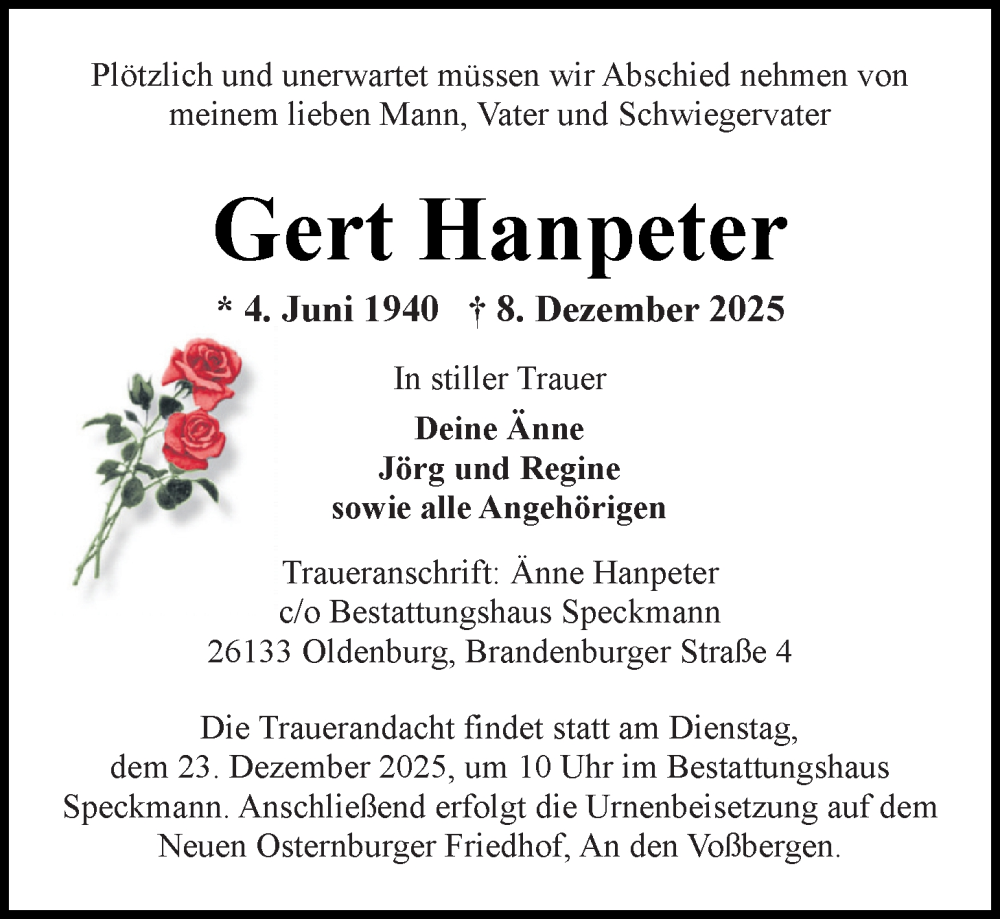 Hier finden Sie alle Traueranzeigen aus der Zeitung, die bisher für Gert Hanpeter erschienen sind. Weitere Traueranzeigen, die in der Zeitung erscheinen, werden hier ebenfalls aufgelistet