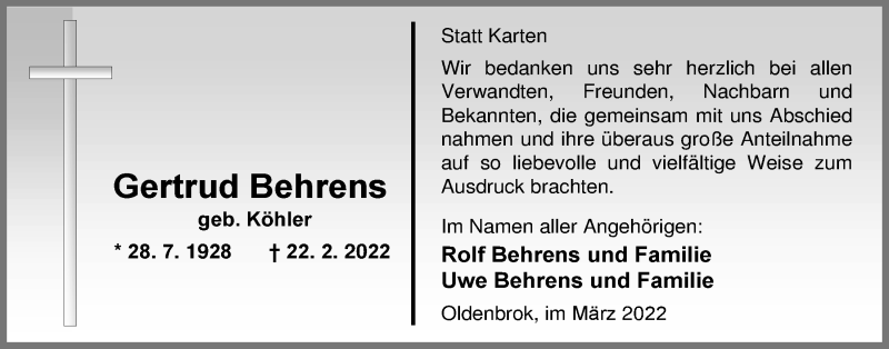 Hier finden Sie alle Traueranzeigen aus der Zeitung, die bisher für Gertrud Behrens erschienen sind. Weitere Traueranzeigen, die in der Zeitung erscheinen, werden hier ebenfalls aufgelistet