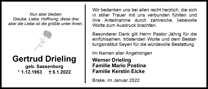 Hier finden Sie alle Traueranzeigen aus der Zeitung, die bisher für Gertrud Drieling erschienen sind. Weitere Traueranzeigen, die in der Zeitung erscheinen, werden hier ebenfalls aufgelistet
