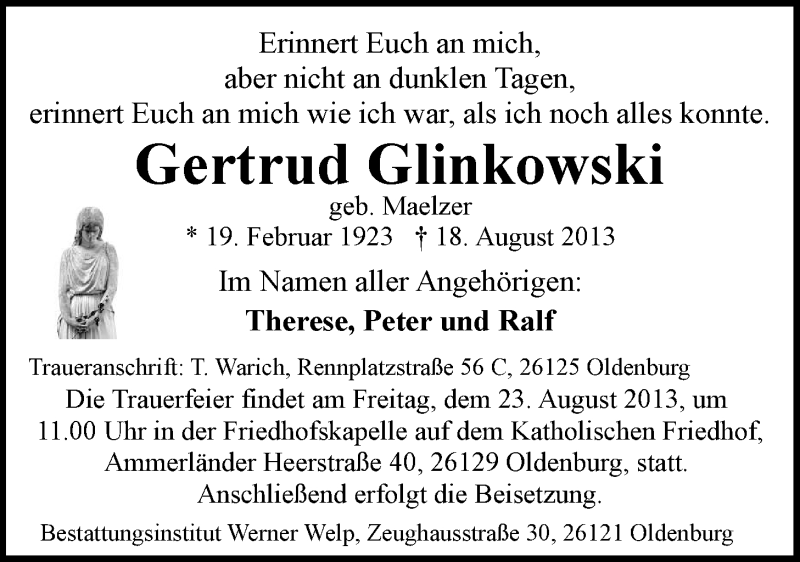 Hier finden Sie alle Traueranzeigen aus der Zeitung, die bisher für Gertrud Glinkowski erschienen sind. Weitere Traueranzeigen, die in der Zeitung erscheinen, werden hier ebenfalls aufgelistet