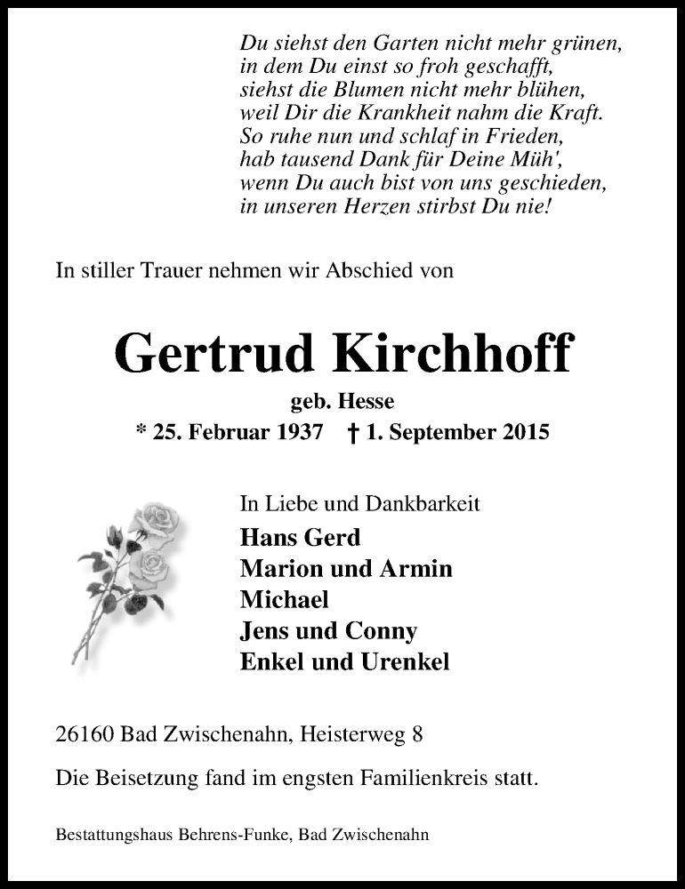 Hier finden Sie alle Traueranzeigen aus der Zeitung, die bisher für Gertrud Kirchhoff erschienen sind. Weitere Traueranzeigen, die in der Zeitung erscheinen, werden hier ebenfalls aufgelistet
