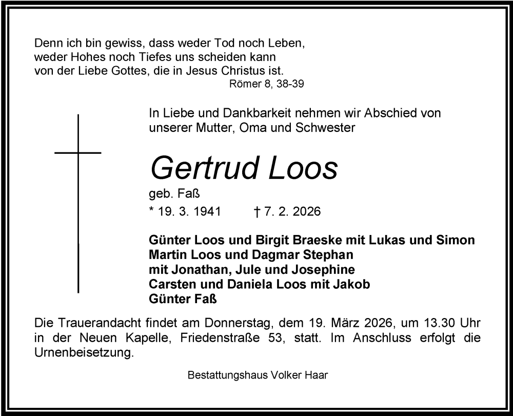 Hier finden Sie alle Traueranzeigen aus der Zeitung, die bisher für Gertrud Loos erschienen sind. Weitere Traueranzeigen, die in der Zeitung erscheinen, werden hier ebenfalls aufgelistet