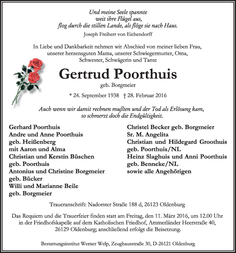 Hier finden Sie alle Traueranzeigen aus der Zeitung, die bisher für Gertrud Poorthuis erschienen sind. Weitere Traueranzeigen, die in der Zeitung erscheinen, werden hier ebenfalls aufgelistet