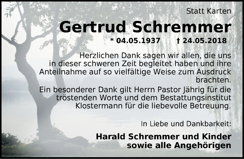 Hier finden Sie alle Traueranzeigen aus der Zeitung, die bisher für Gertrud Schremmer erschienen sind. Weitere Traueranzeigen, die in der Zeitung erscheinen, werden hier ebenfalls aufgelistet