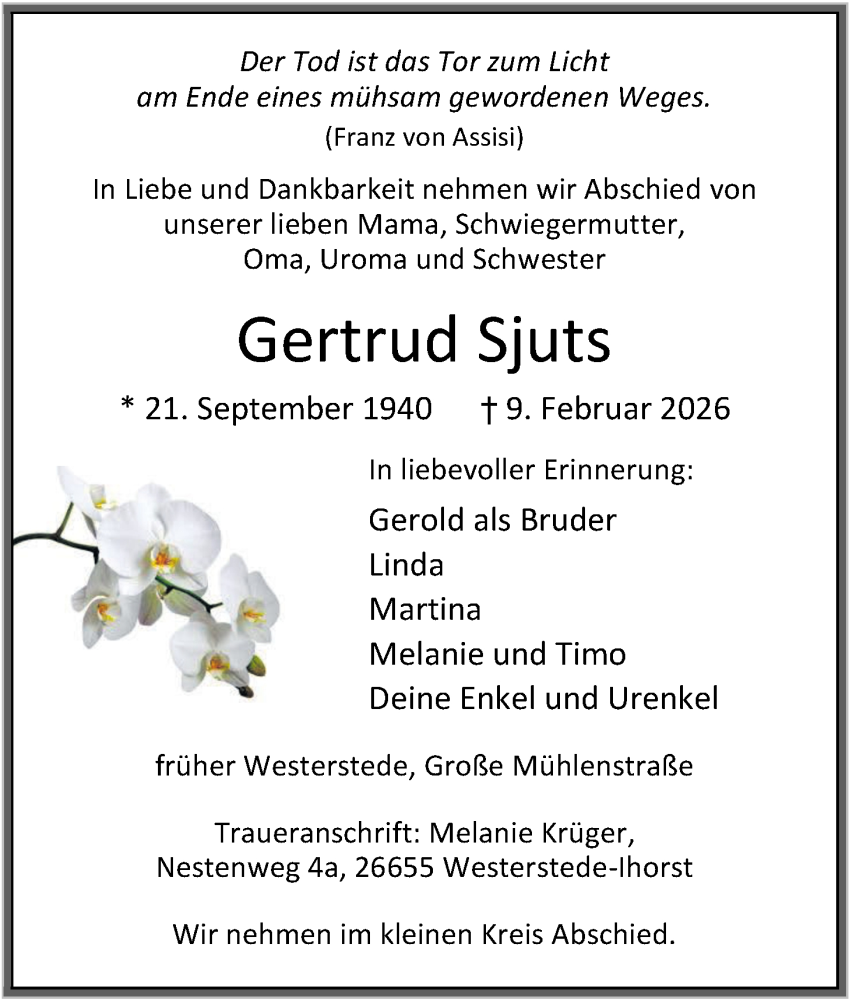 Hier finden Sie alle Traueranzeigen aus der Zeitung, die bisher für Gertrud Sjuts erschienen sind. Weitere Traueranzeigen, die in der Zeitung erscheinen, werden hier ebenfalls aufgelistet