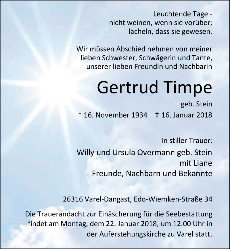 Hier finden Sie alle Traueranzeigen aus der Zeitung, die bisher für Gertrud Timpe erschienen sind. Weitere Traueranzeigen, die in der Zeitung erscheinen, werden hier ebenfalls aufgelistet