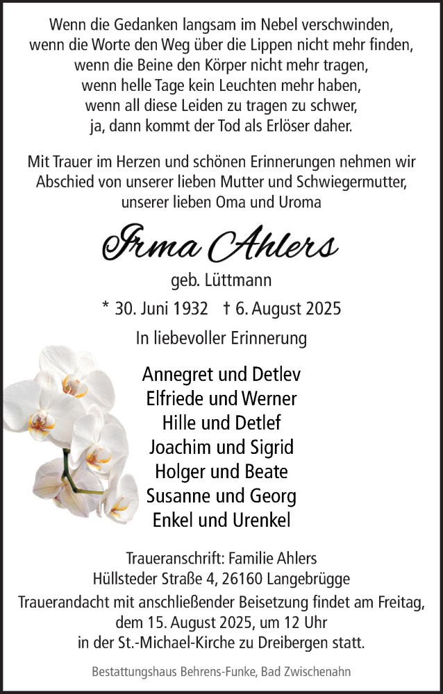 Hier finden Sie alle Traueranzeigen aus der Zeitung, die bisher für Gima Ahlers erschienen sind. Weitere Traueranzeigen, die in der Zeitung erscheinen, werden hier ebenfalls aufgelistet