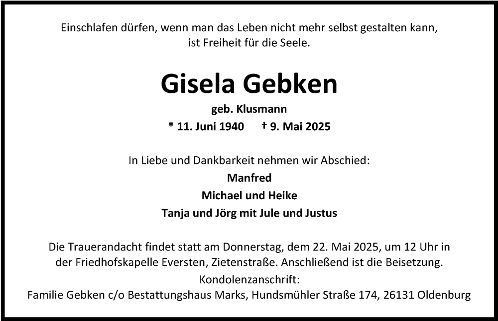 Hier finden Sie alle Traueranzeigen aus der Zeitung, die bisher für Gisela Gebken erschienen sind. Weitere Traueranzeigen, die in der Zeitung erscheinen, werden hier ebenfalls aufgelistet