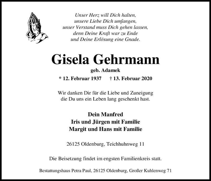 Hier finden Sie alle Traueranzeigen aus der Zeitung, die bisher für Gisela Gehrmann erschienen sind. Weitere Traueranzeigen, die in der Zeitung erscheinen, werden hier ebenfalls aufgelistet