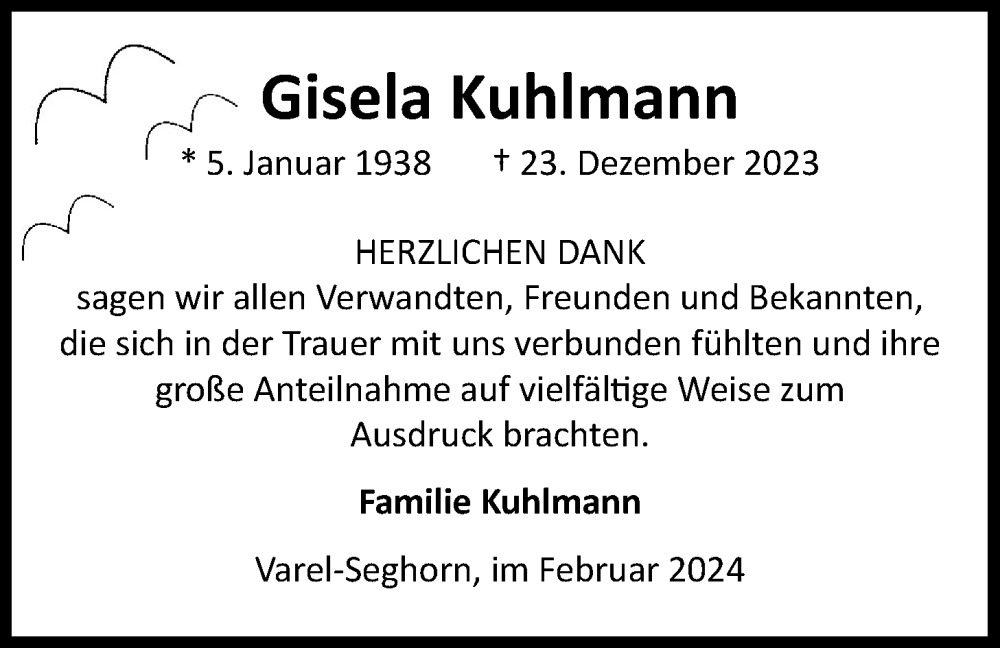 Hier finden Sie alle Traueranzeigen aus der Zeitung, die bisher für Gisela Kuhlmann erschienen sind. Weitere Traueranzeigen, die in der Zeitung erscheinen, werden hier ebenfalls aufgelistet