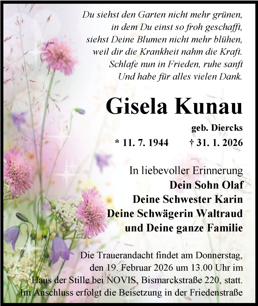 Hier finden Sie alle Traueranzeigen aus der Zeitung, die bisher für Gisela Kunau erschienen sind. Weitere Traueranzeigen, die in der Zeitung erscheinen, werden hier ebenfalls aufgelistet