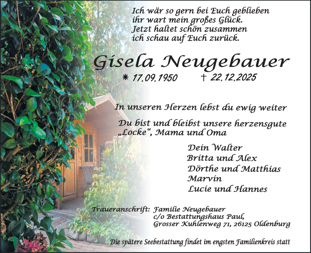 Hier finden Sie alle Traueranzeigen aus der Zeitung, die bisher für Gisela Neugebauer erschienen sind. Weitere Traueranzeigen, die in der Zeitung erscheinen, werden hier ebenfalls aufgelistet