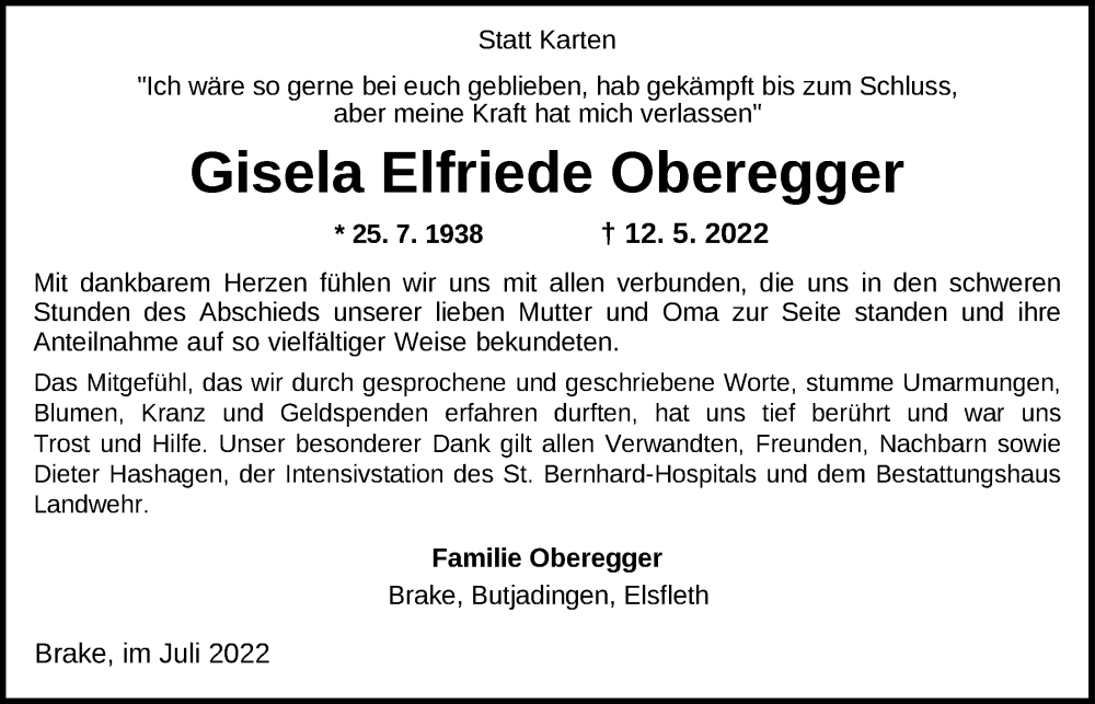 Hier finden Sie alle Traueranzeigen aus der Zeitung, die bisher für Gisela Oberegger erschienen sind. Weitere Traueranzeigen, die in der Zeitung erscheinen, werden hier ebenfalls aufgelistet