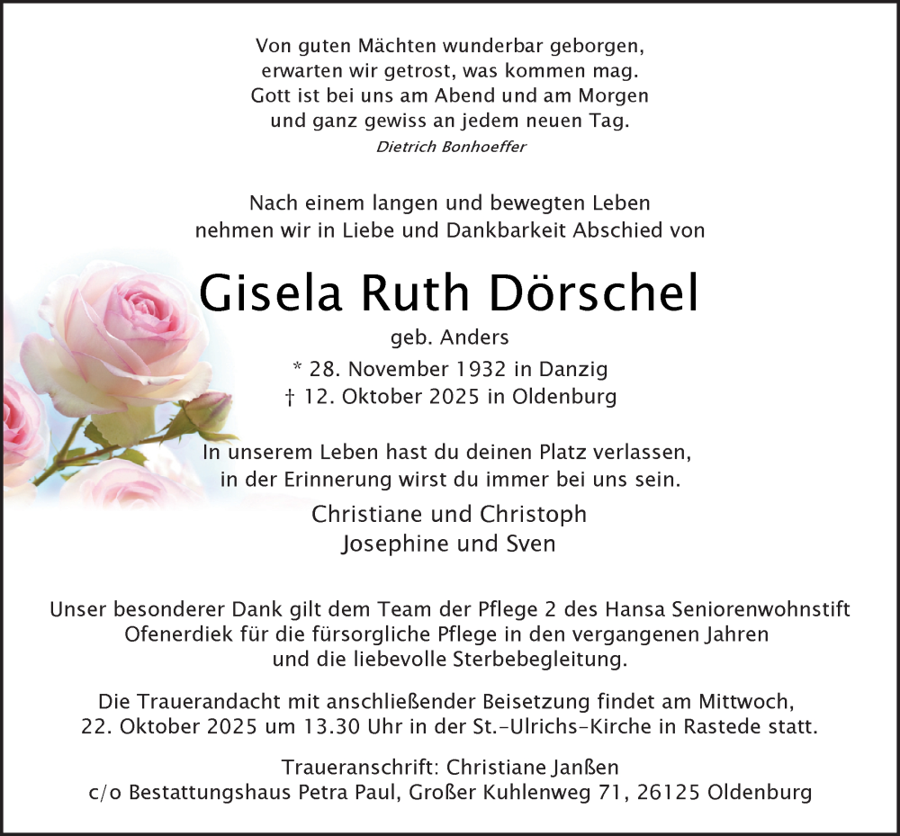 Hier finden Sie alle Traueranzeigen aus der Zeitung, die bisher für Gisela Ruth Dörschel erschienen sind. Weitere Traueranzeigen, die in der Zeitung erscheinen, werden hier ebenfalls aufgelistet