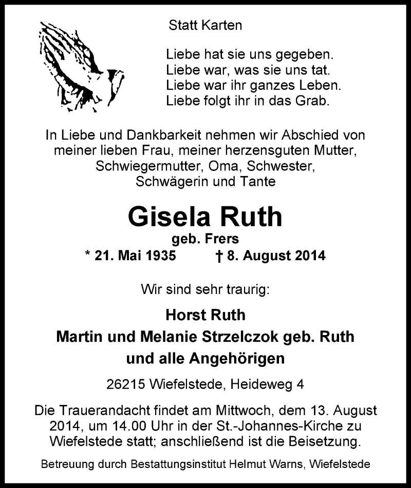 Hier finden Sie alle Traueranzeigen aus der Zeitung, die bisher für Gisela Ruth erschienen sind. Weitere Traueranzeigen, die in der Zeitung erscheinen, werden hier ebenfalls aufgelistet