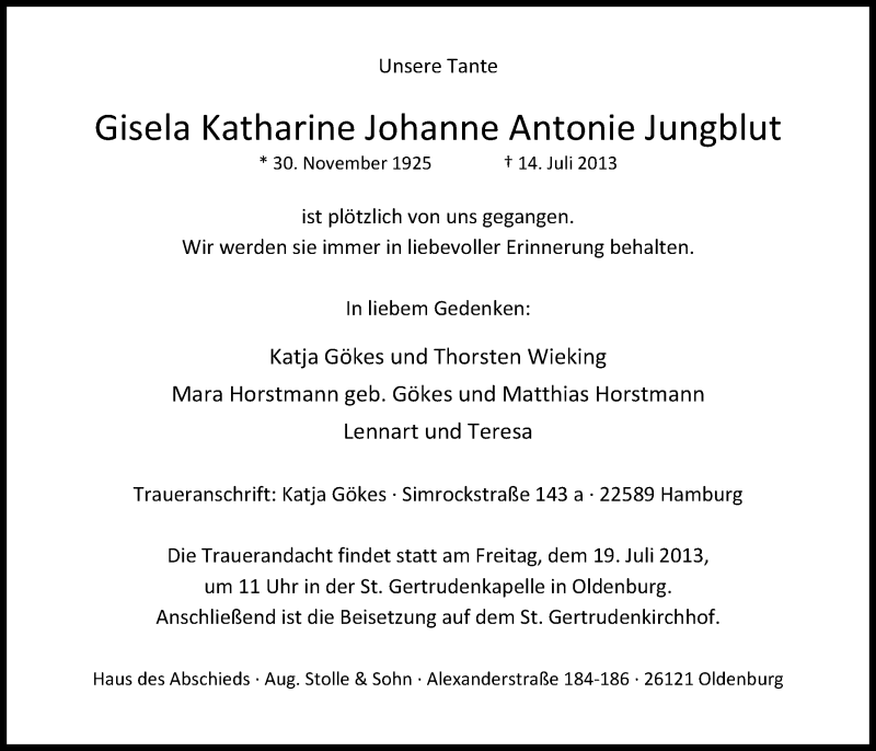 Hier finden Sie alle Traueranzeigen aus der Zeitung, die bisher für Gisela Katharine Johanne Antonie Jungblut erschienen sind. Weitere Traueranzeigen, die in der Zeitung erscheinen, werden hier ebenfalls aufgelistet
