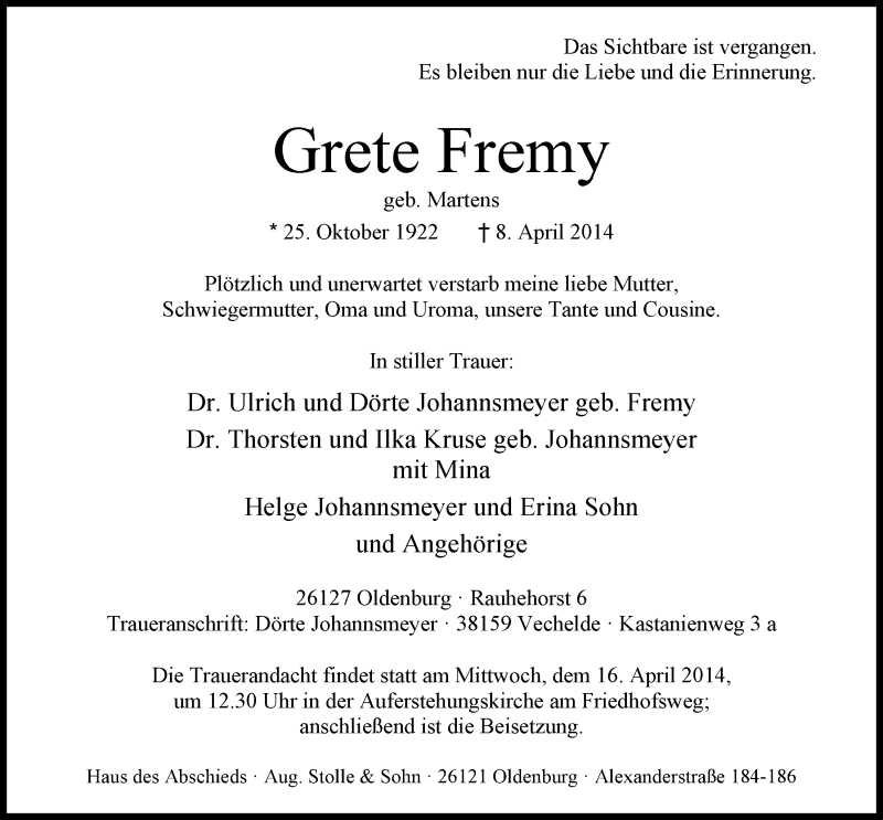 Hier finden Sie alle Traueranzeigen aus der Zeitung, die bisher für Grete Fremy erschienen sind. Weitere Traueranzeigen, die in der Zeitung erscheinen, werden hier ebenfalls aufgelistet