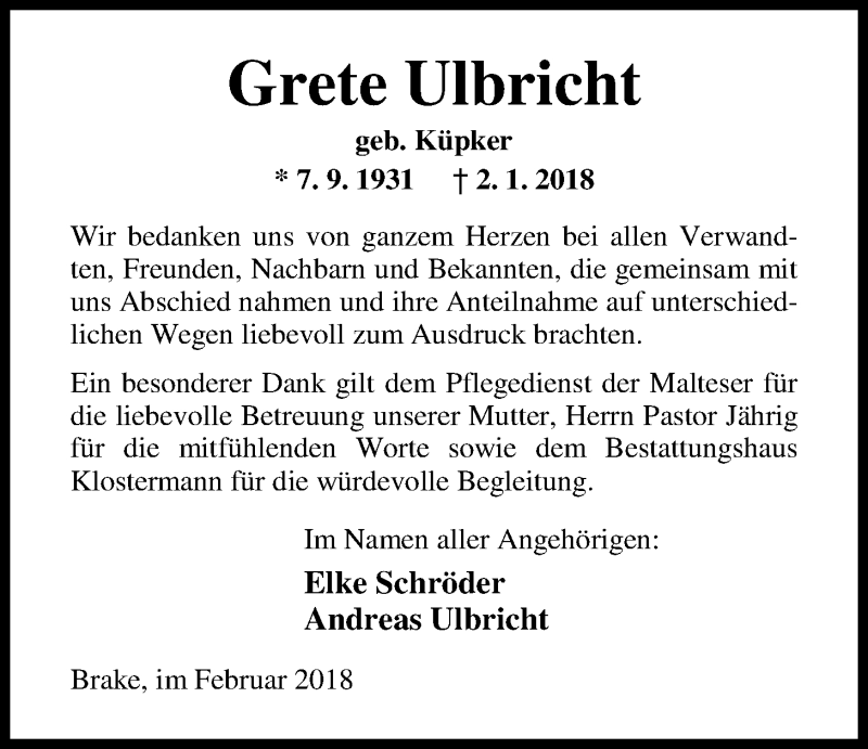 Hier finden Sie alle Traueranzeigen aus der Zeitung, die bisher für Grete Ulbricht erschienen sind. Weitere Traueranzeigen, die in der Zeitung erscheinen, werden hier ebenfalls aufgelistet
