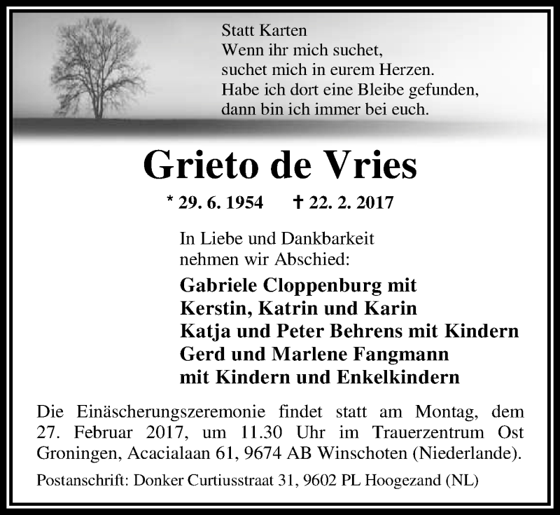 Hier finden Sie alle Traueranzeigen aus der Zeitung, die bisher für Grieto de Vries erschienen sind. Weitere Traueranzeigen, die in der Zeitung erscheinen, werden hier ebenfalls aufgelistet