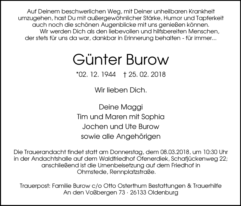 Hier finden Sie alle Traueranzeigen aus der Zeitung, die bisher für Günter Burow erschienen sind. Weitere Traueranzeigen, die in der Zeitung erscheinen, werden hier ebenfalls aufgelistet