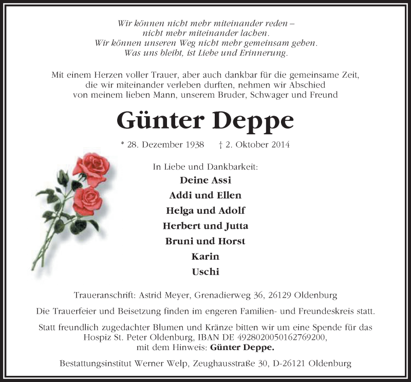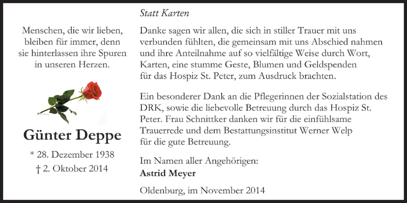 Hier finden Sie alle Traueranzeigen aus der Zeitung, die bisher für Günter Deppe erschienen sind. Weitere Traueranzeigen, die in der Zeitung erscheinen, werden hier ebenfalls aufgelistet