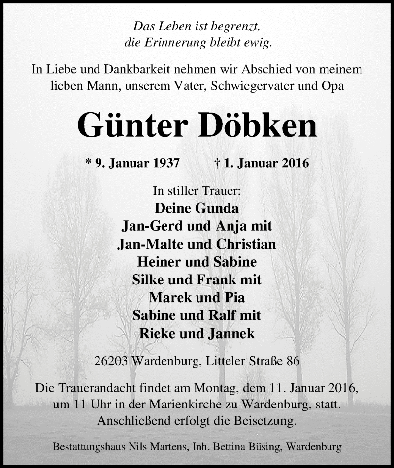 Hier finden Sie alle Traueranzeigen aus der Zeitung, die bisher für Günter Döbken erschienen sind. Weitere Traueranzeigen, die in der Zeitung erscheinen, werden hier ebenfalls aufgelistet