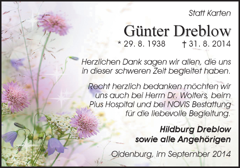 Hier finden Sie alle Traueranzeigen aus der Zeitung, die bisher für Günter Dreblow erschienen sind. Weitere Traueranzeigen, die in der Zeitung erscheinen, werden hier ebenfalls aufgelistet