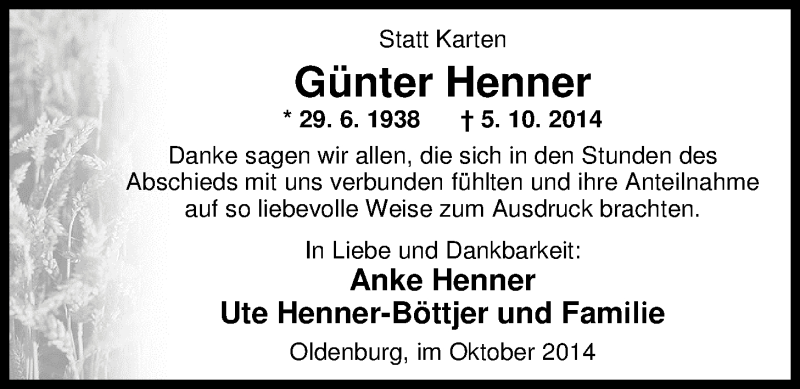 Hier finden Sie alle Traueranzeigen aus der Zeitung, die bisher für Günter Henner erschienen sind. Weitere Traueranzeigen, die in der Zeitung erscheinen, werden hier ebenfalls aufgelistet
