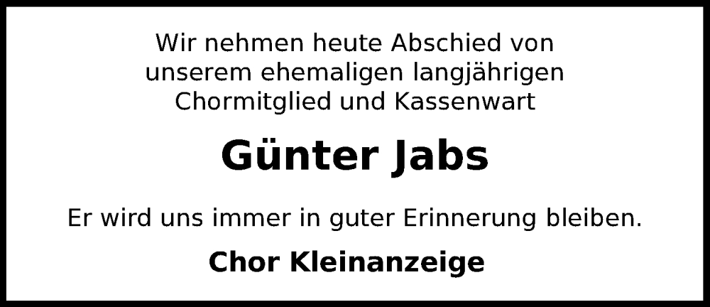 Hier finden Sie alle Traueranzeigen aus der Zeitung, die bisher für Günter Jabs erschienen sind. Weitere Traueranzeigen, die in der Zeitung erscheinen, werden hier ebenfalls aufgelistet