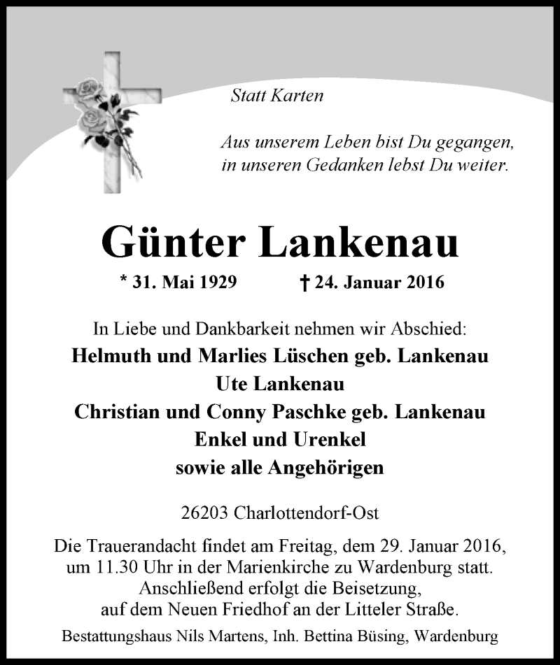 Hier finden Sie alle Traueranzeigen aus der Zeitung, die bisher für Günter Lankenau erschienen sind. Weitere Traueranzeigen, die in der Zeitung erscheinen, werden hier ebenfalls aufgelistet