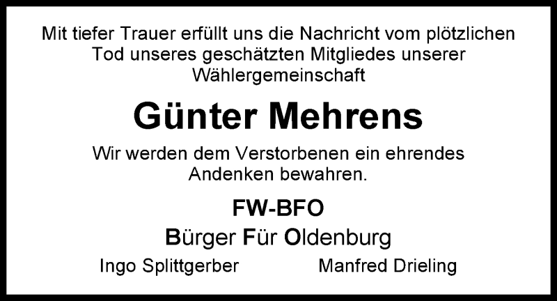 Hier finden Sie alle Traueranzeigen aus der Zeitung, die bisher für Günter Mehrens erschienen sind. Weitere Traueranzeigen, die in der Zeitung erscheinen, werden hier ebenfalls aufgelistet