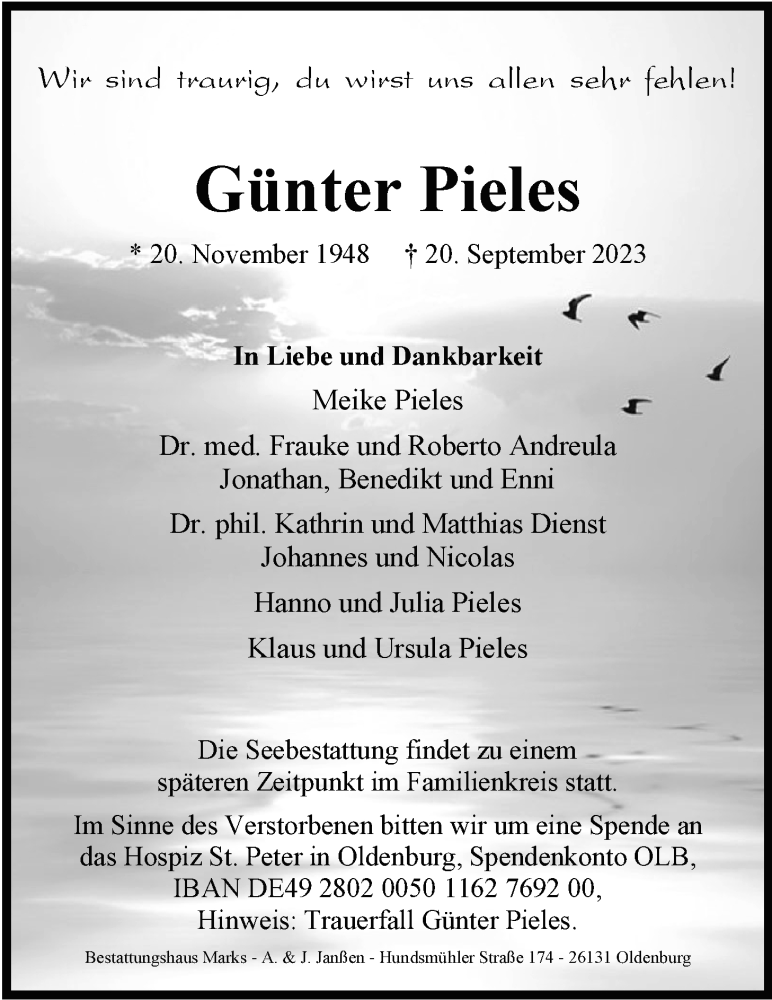 Hier finden Sie alle Traueranzeigen aus der Zeitung, die bisher für Günter Pieles erschienen sind. Weitere Traueranzeigen, die in der Zeitung erscheinen, werden hier ebenfalls aufgelistet