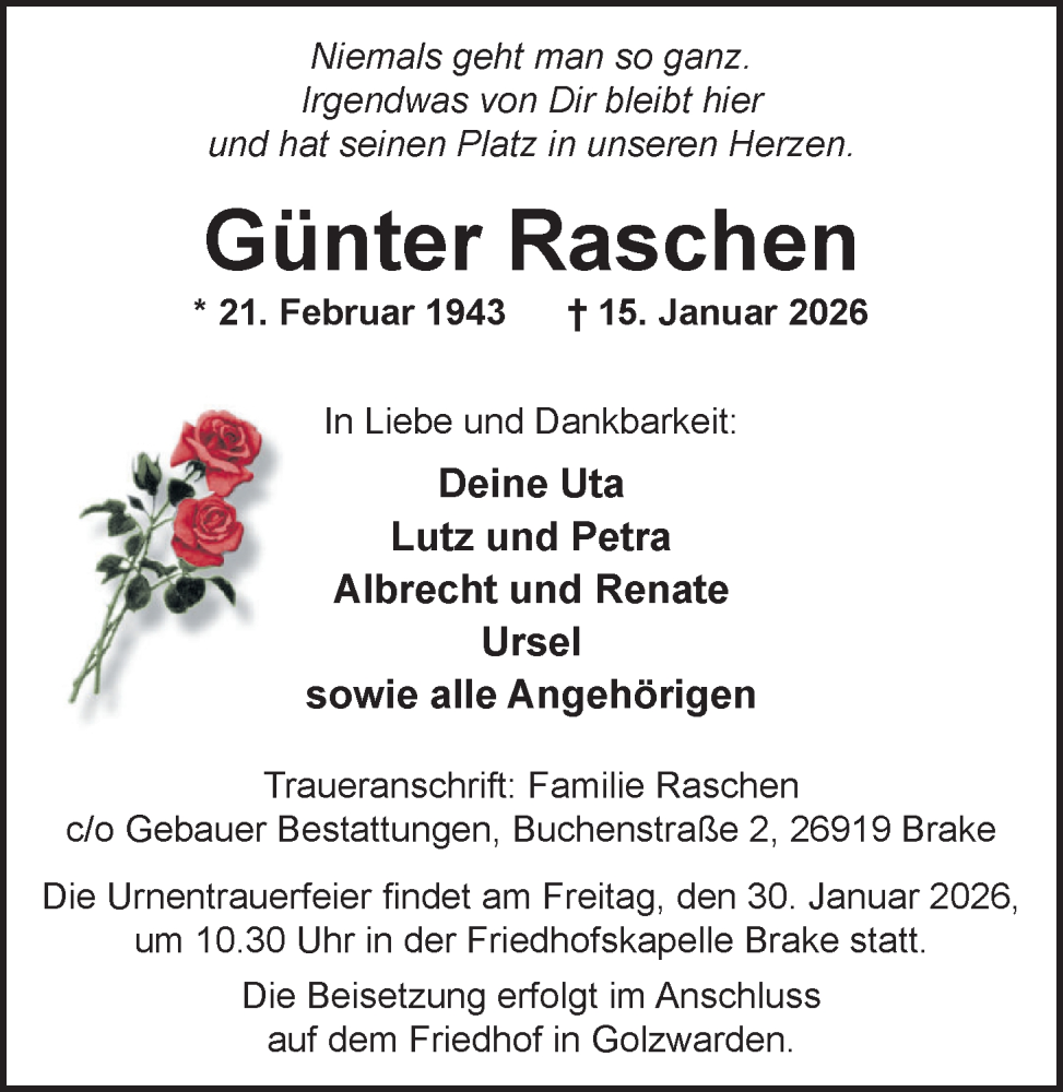 Hier finden Sie alle Traueranzeigen aus der Zeitung, die bisher für Günter Raschen erschienen sind. Weitere Traueranzeigen, die in der Zeitung erscheinen, werden hier ebenfalls aufgelistet