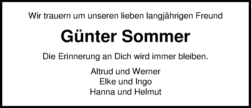 Hier finden Sie alle Traueranzeigen aus der Zeitung, die bisher für Günter Sommer erschienen sind. Weitere Traueranzeigen, die in der Zeitung erscheinen, werden hier ebenfalls aufgelistet