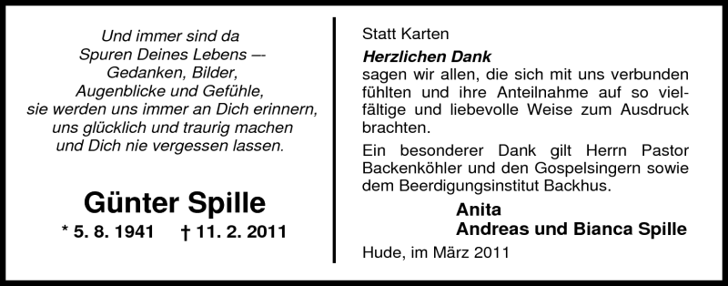 Hier finden Sie alle Traueranzeigen aus der Zeitung, die bisher für Günter Spille erschienen sind. Weitere Traueranzeigen, die in der Zeitung erscheinen, werden hier ebenfalls aufgelistet
