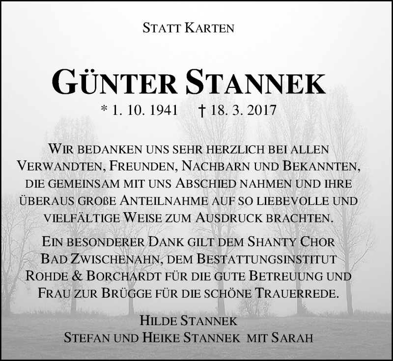 Hier finden Sie alle Traueranzeigen aus der Zeitung, die bisher für Günter Stannek erschienen sind. Weitere Traueranzeigen, die in der Zeitung erscheinen, werden hier ebenfalls aufgelistet
