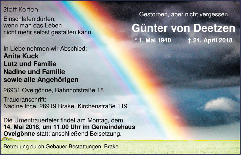 Hier finden Sie alle Traueranzeigen aus der Zeitung, die bisher für Günter von Deetzen erschienen sind. Weitere Traueranzeigen, die in der Zeitung erscheinen, werden hier ebenfalls aufgelistet