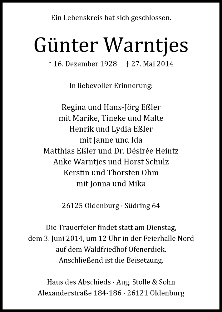 Hier finden Sie alle Traueranzeigen aus der Zeitung, die bisher für Günter Warntjes erschienen sind. Weitere Traueranzeigen, die in der Zeitung erscheinen, werden hier ebenfalls aufgelistet