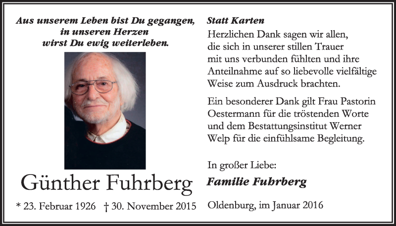 Hier finden Sie alle Traueranzeigen aus der Zeitung, die bisher für Günther Fuhrberg erschienen sind. Weitere Traueranzeigen, die in der Zeitung erscheinen, werden hier ebenfalls aufgelistet