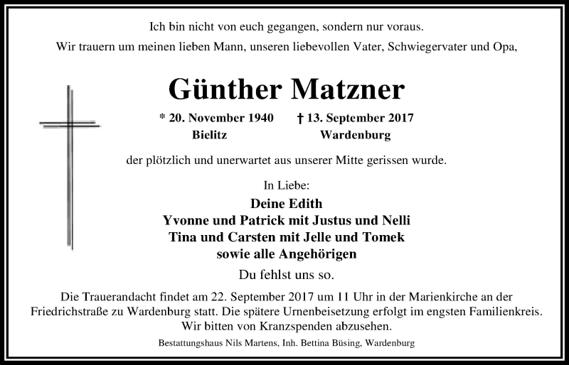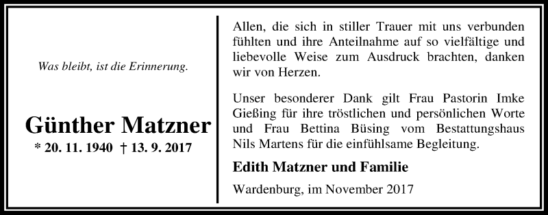 Hier finden Sie alle Traueranzeigen aus der Zeitung, die bisher für Günther Matzner erschienen sind. Weitere Traueranzeigen, die in der Zeitung erscheinen, werden hier ebenfalls aufgelistet