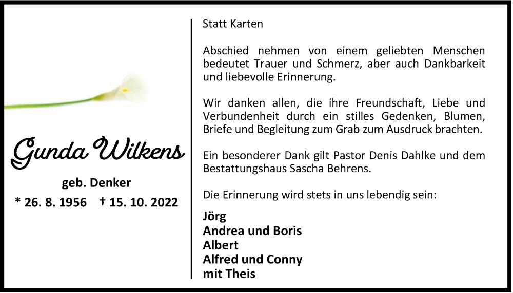 Hier finden Sie alle Traueranzeigen aus der Zeitung, die bisher für Gunda Wilkens erschienen sind. Weitere Traueranzeigen, die in der Zeitung erscheinen, werden hier ebenfalls aufgelistet