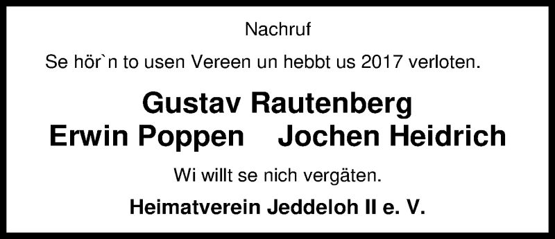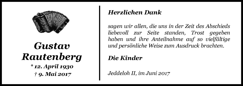 Hier finden Sie alle Traueranzeigen aus der Zeitung, die bisher für Gustav Rautenberg erschienen sind. Weitere Traueranzeigen, die in der Zeitung erscheinen, werden hier ebenfalls aufgelistet