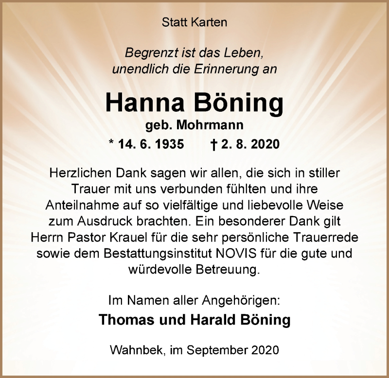 Hier finden Sie alle Traueranzeigen aus der Zeitung, die bisher für Hanna Böning erschienen sind. Weitere Traueranzeigen, die in der Zeitung erscheinen, werden hier ebenfalls aufgelistet