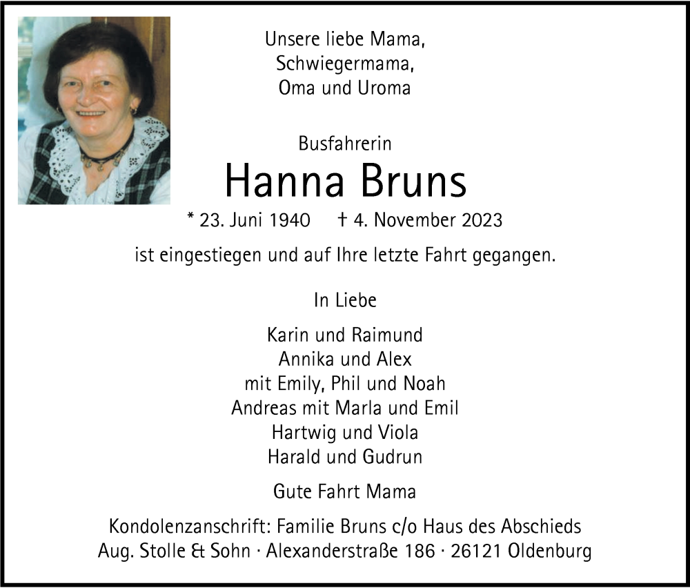 Hier finden Sie alle Traueranzeigen aus der Zeitung, die bisher für Hanna Bruns erschienen sind. Weitere Traueranzeigen, die in der Zeitung erscheinen, werden hier ebenfalls aufgelistet