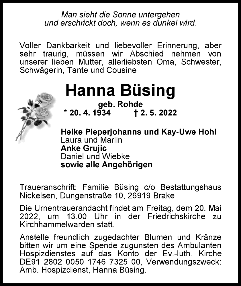 Hier finden Sie alle Traueranzeigen aus der Zeitung, die bisher für Hanna Büsing erschienen sind. Weitere Traueranzeigen, die in der Zeitung erscheinen, werden hier ebenfalls aufgelistet