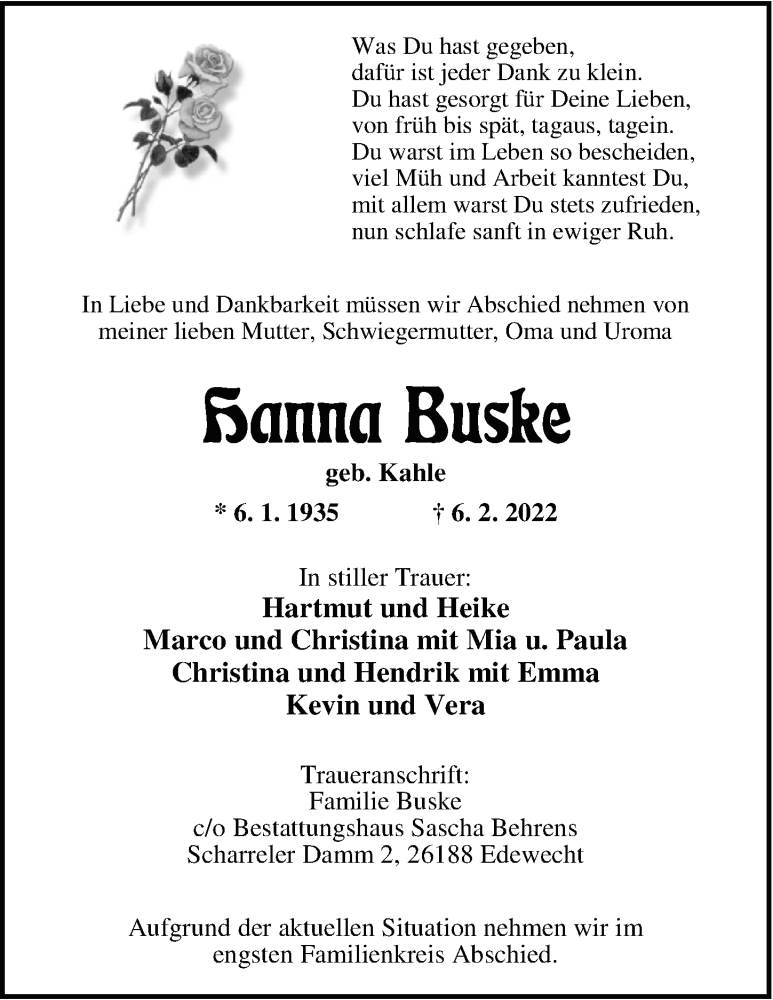 Hier finden Sie alle Traueranzeigen aus der Zeitung, die bisher für Hanna Buske erschienen sind. Weitere Traueranzeigen, die in der Zeitung erscheinen, werden hier ebenfalls aufgelistet