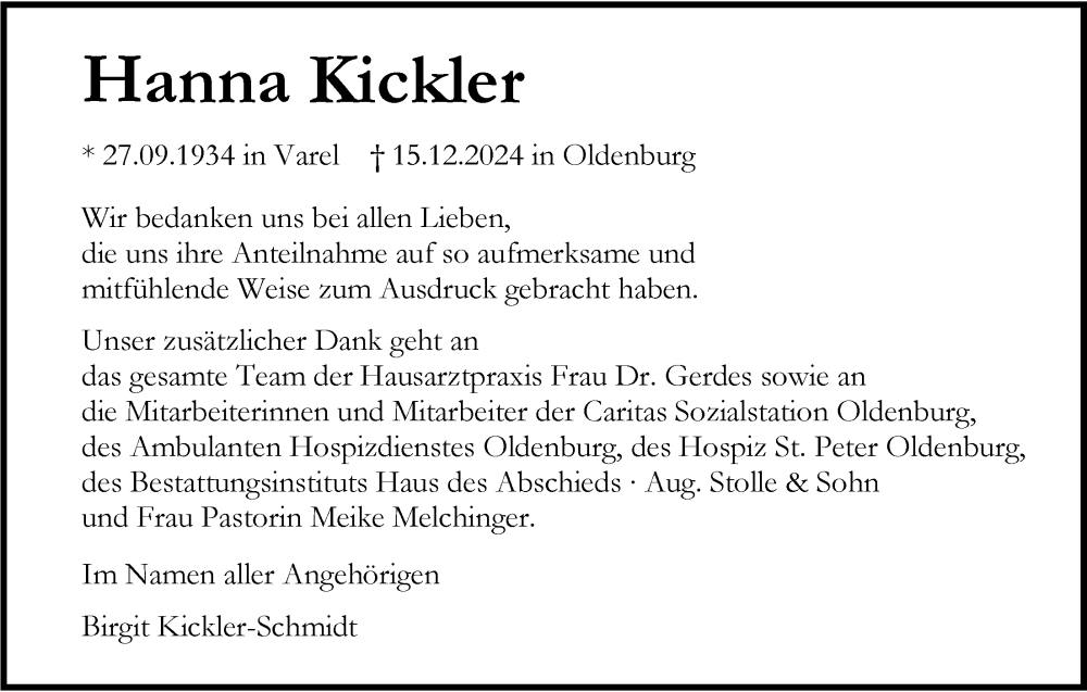 Hier finden Sie alle Traueranzeigen aus der Zeitung, die bisher für Hanna Kickler erschienen sind. Weitere Traueranzeigen, die in der Zeitung erscheinen, werden hier ebenfalls aufgelistet
