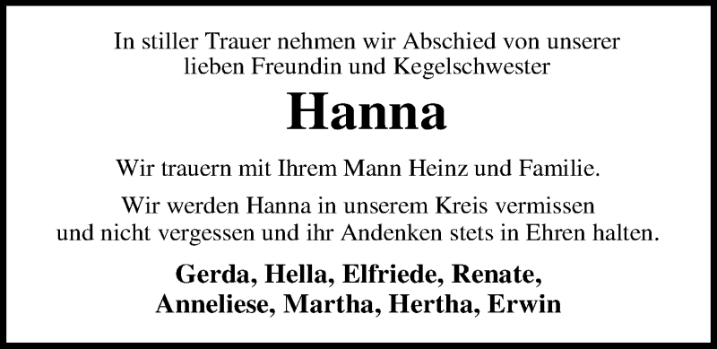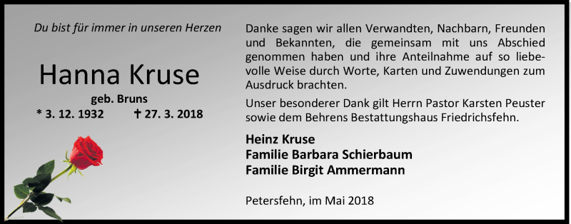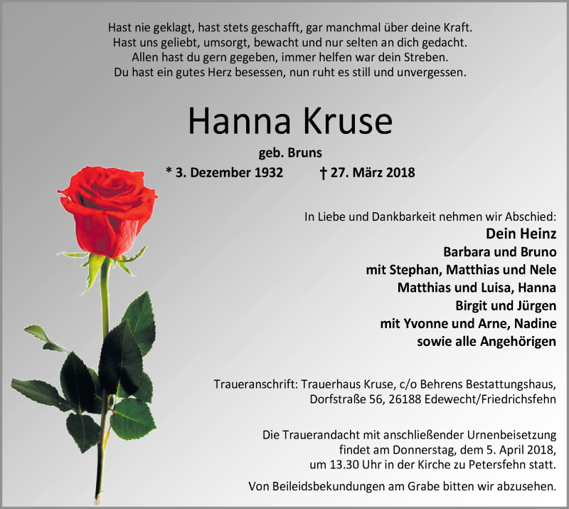 Hier finden Sie alle Traueranzeigen aus der Zeitung, die bisher für Hanna Kruse erschienen sind. Weitere Traueranzeigen, die in der Zeitung erscheinen, werden hier ebenfalls aufgelistet