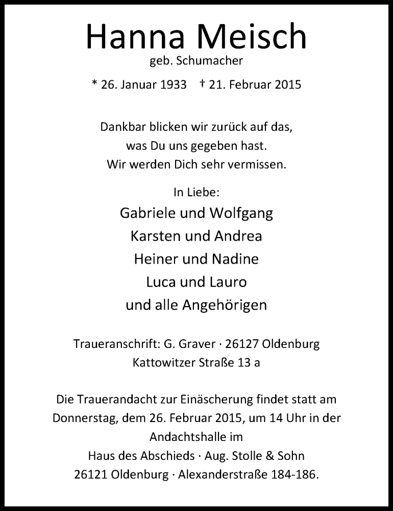 Hier finden Sie alle Traueranzeigen aus der Zeitung, die bisher für Hanna Meisch erschienen sind. Weitere Traueranzeigen, die in der Zeitung erscheinen, werden hier ebenfalls aufgelistet