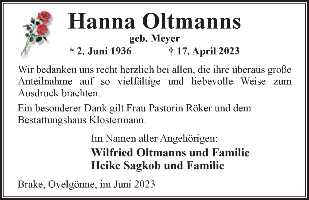 Hier finden Sie alle Traueranzeigen aus der Zeitung, die bisher für Hanna Oltmanns erschienen sind. Weitere Traueranzeigen, die in der Zeitung erscheinen, werden hier ebenfalls aufgelistet